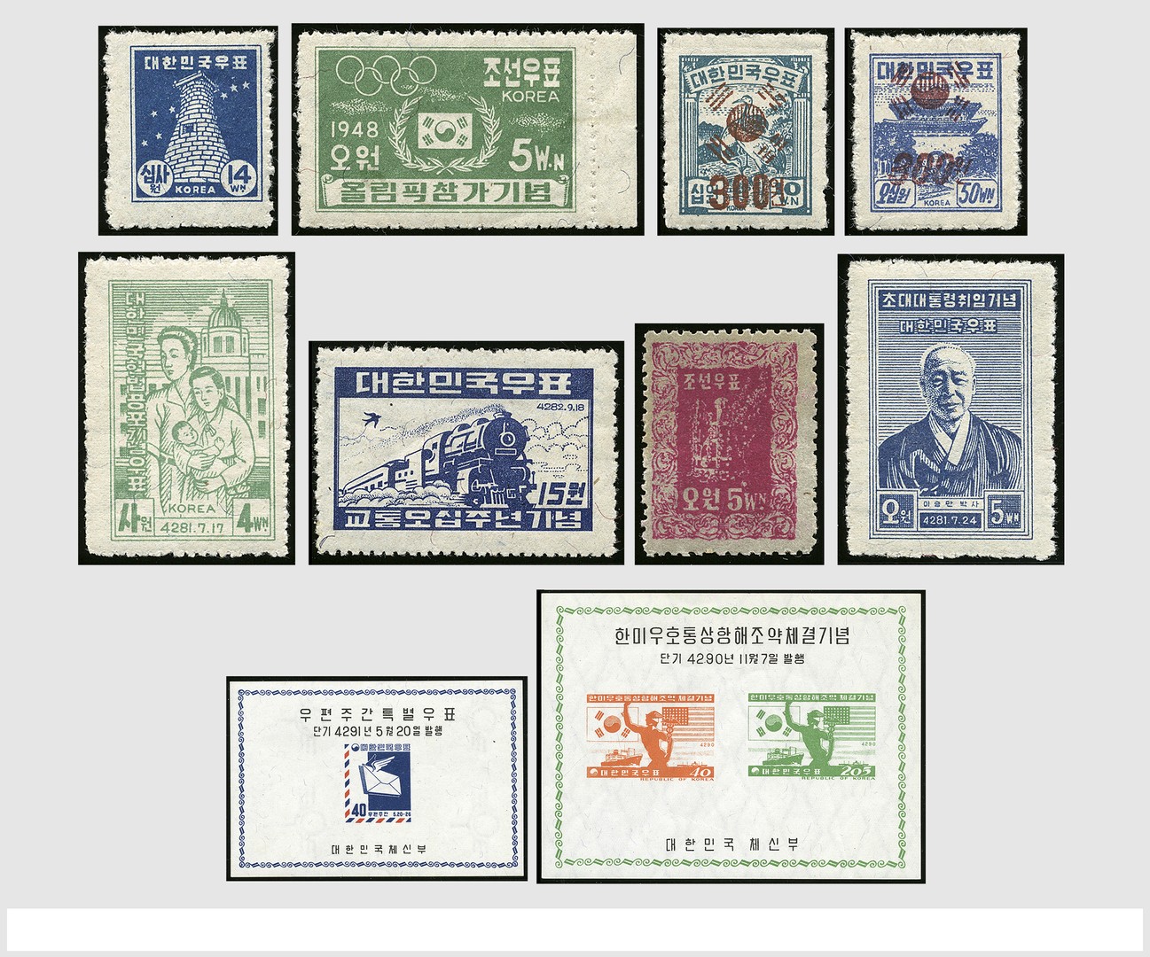 KOREA-ZUID 1946-1995, verz. met doubletten in 7 albums en 5 insteekboeken, wb. vele betere nrs. o.a. Mi.18C, 34/35, 37/38, 39, 43b, 56, 82, 90, blokken wb. 121, 125, 126, 127, 173I/II, vele langlopende series, typen, tandingen, waarbij vele uitg. ook ongetand, etc., etc. Een mooie stock met enorme waarde!