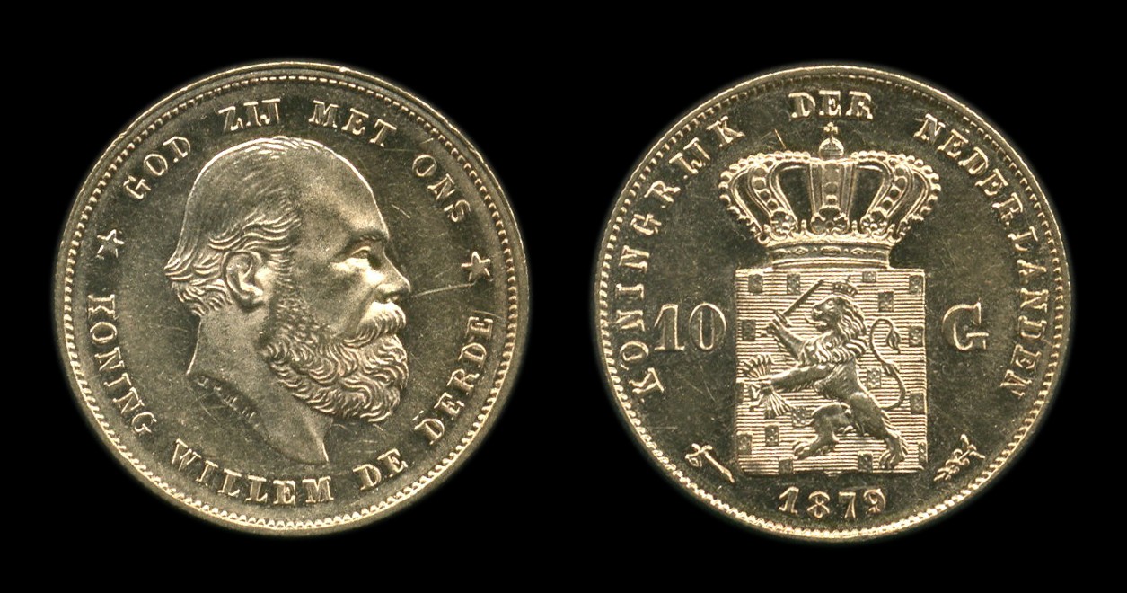 NEDERLAND, Gouden 10 Gulden Willem III 1879 uit 1877 (Sch. 552a) zfr.