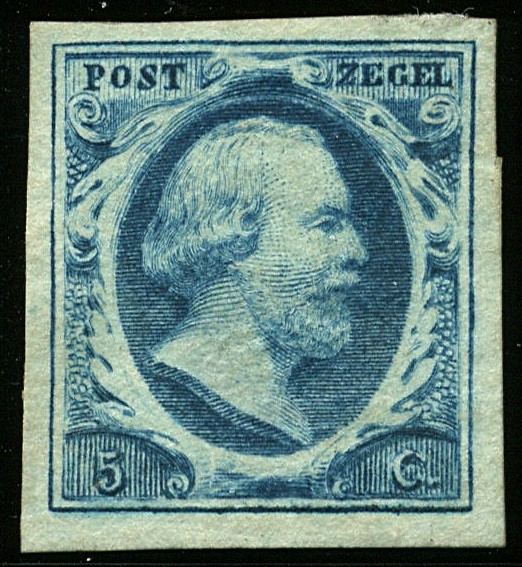 1a-Pl.I-11. 5 Cent diepdonkerblauw, ongebruikt mooi gerande zegel met nog een restje originele gom. € 650