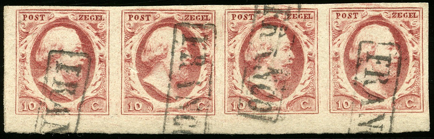 2m-Pl.VII-96/99. Breed tot zeer breed gerande onderrand strip van vier. Zegel 98 heeft een (originele, zie afstempeling?) papierplooi, hetgeen aan het aspect voor het oog niets afdoet. € 900