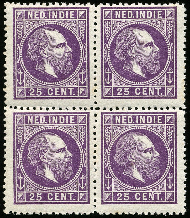 13C, 25 Cent donkerpaars in lijntanding 13¼ x 14 kl.g. Postfris prachtblok van vier met volle, originele gom, zeer fris van kleur. € 1000