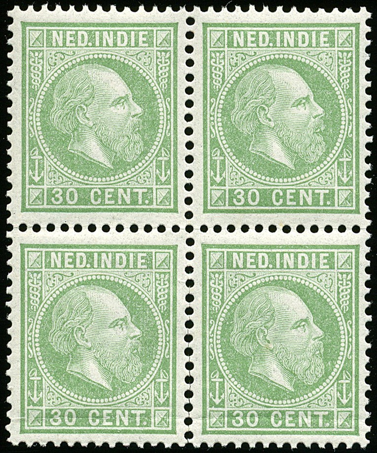 14K, 30 Cent groen, postfris prachtblok van vier met volle, originele gom, onderste zegel originele gomvouw en iets los op tanding. € 1400