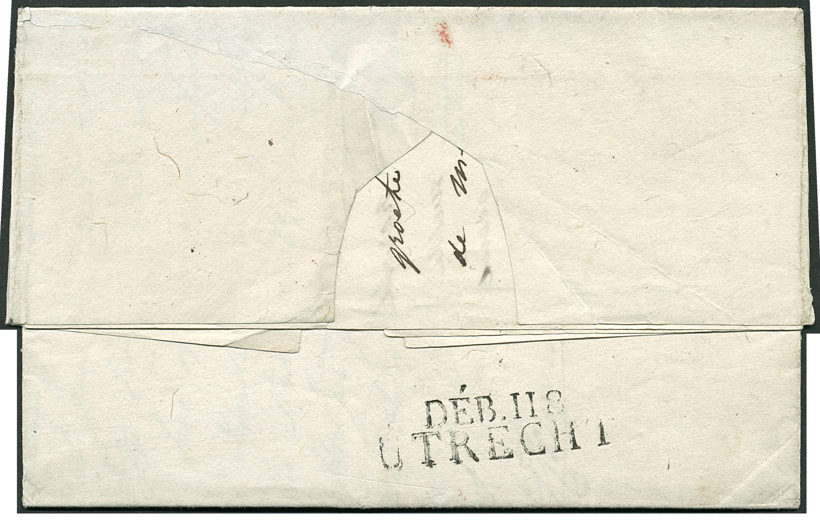 Déboursé. Frisse, cpl. vouwbrief van Batavia 20-10-1820 over Amsterdam naar een Madame te Utrecht, doorgez. naar Leijden, met op az. in zwart ´DEB.118/UTRECHT´
