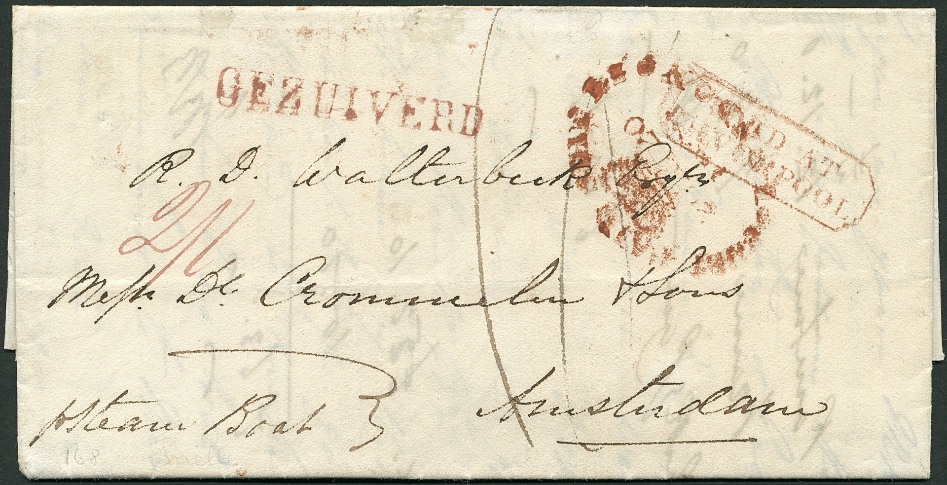 Zeer frisse, cpl. vouwbrief van Liverpool 19-4-1832 ´p Steamer Brat´ via Londen 20-4 naar Amsterdam 24-4, ontsmet tegen cholera en afgest. ´GEZUIVERD´. Op az. ´Engeland/over Brielle´. Prachtbrief! Ex van Dieten