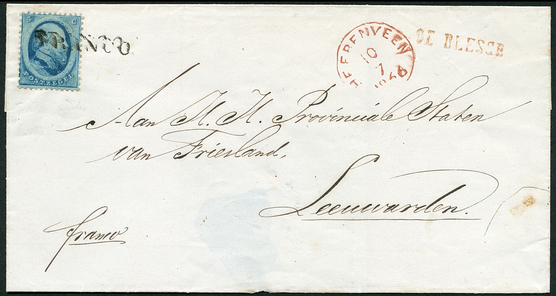 5 Cent (vrijwel prachtex.) afgest. Franco zonder kader (K.33) op frisse, dichtgeplakte briefomslag van DE BLESSE (rood naamstempel) over Heerenveen 10-7-1866 naar Leeuwarden 10-7