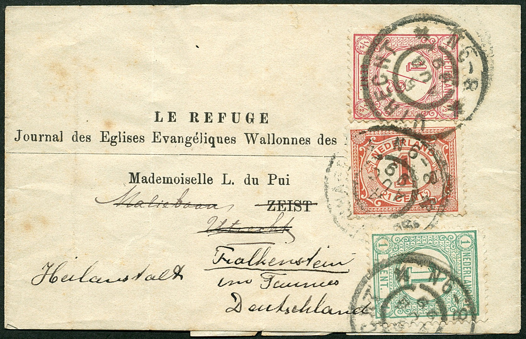 Mengfrankering Cijferemissies 1894 en 1899. Omslagbandje gefr. met 1c nr. 51 van ´sGravenhage 4-8-1899 naar Zeist, doorgez. naar Utrecht 5-8, daar voorzien van zegels van ½c en 1c (mist hoekje) nrs. 30b/31a en verder naar Duitsland