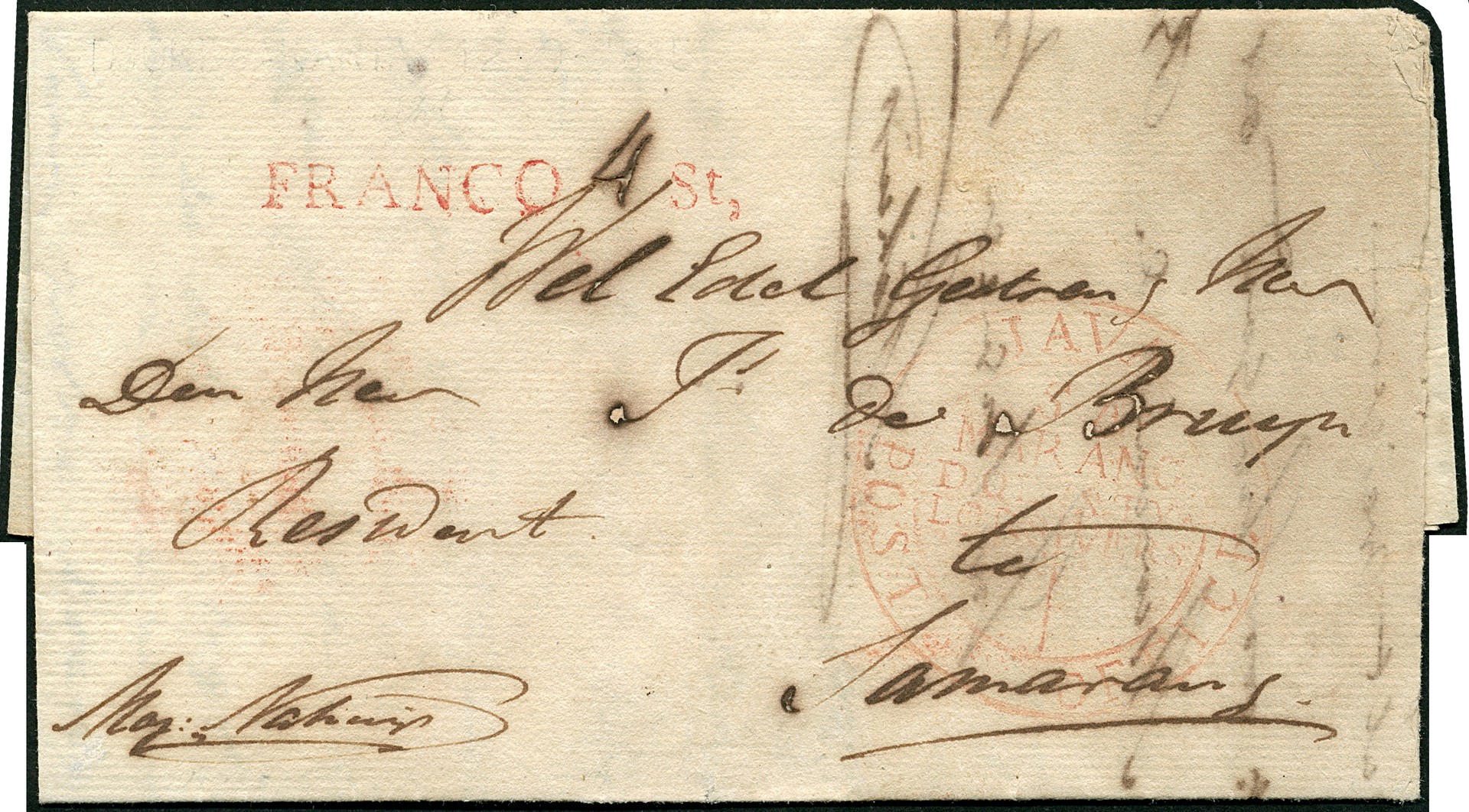 Engels Tussenbestuur. Lichte, rode afdruk JAVA POST OFFICE SAMARANG (WdB.14) op cpl. vouwbrief van Majoor Nahuijs te Djocjocarta 12-9-1815 naar de resident van Samarang, met tevens op vz. in rood ´FRANCO St´, waarin geschreven port ´4´ (WdB.35). Tevens briefvz. van dezelfde afz. naar dezelfde resident met het stempel ´FRANCO St´ (alleen bekend op brieven uit Djokjakarta). Ex Wolff de Beer (zie afb. op blz. 56)