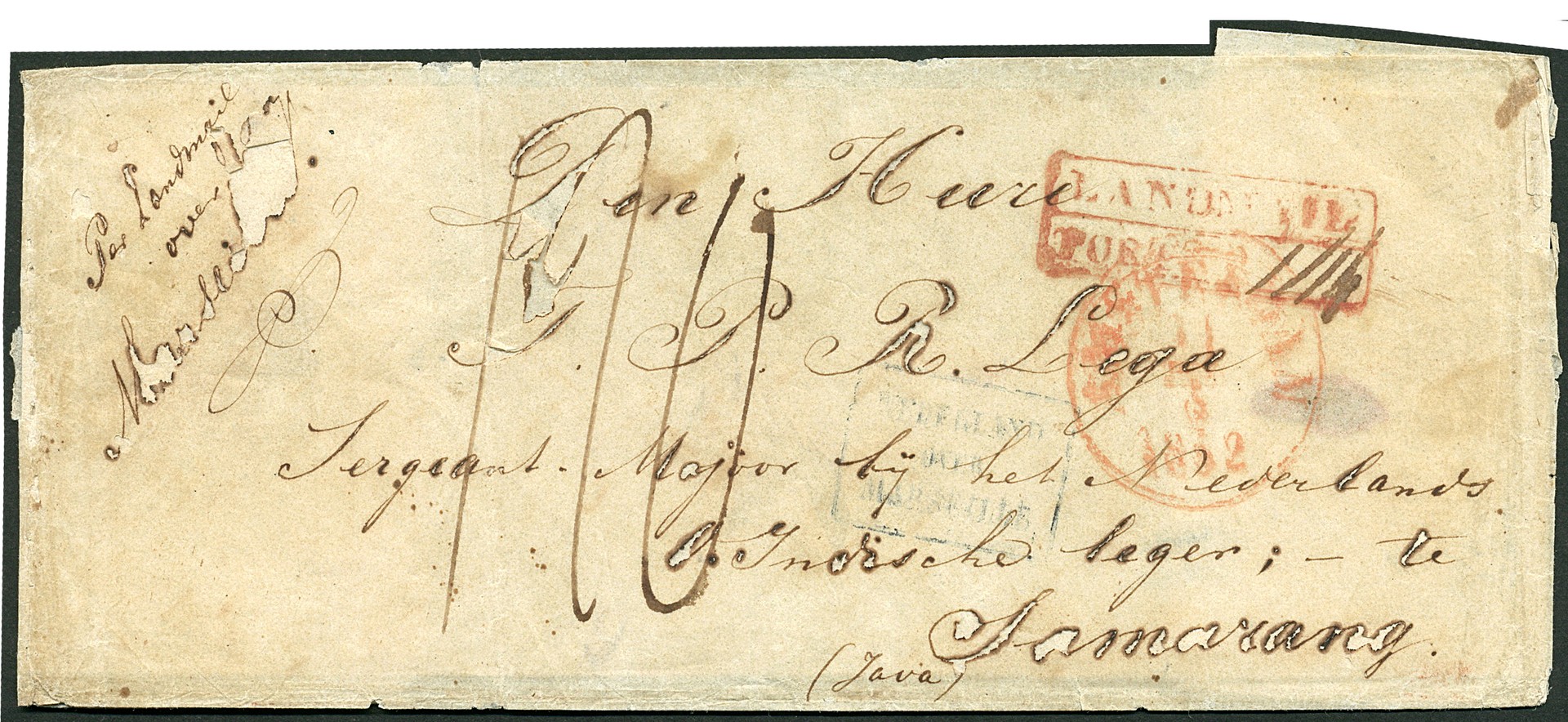 Landmail-stempel in rood met daarin geschreven port '144' (WdB.351a) op briefomslag (iets inktvraat) van Amsterdam 21-5-1852 (az. geschreven vertrekdatum 20 Mei 1852) over Marseille (routestempel in blauw, WdB.353) naar een sergeant-majoor bij het KNIL te Samarang (zie ook veiling 632, kavel 1227)