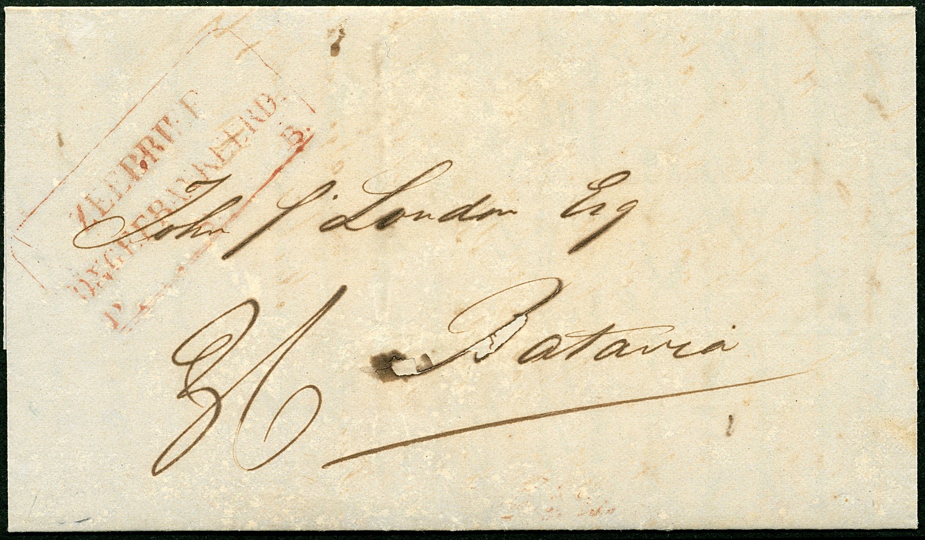 Rechthoekig stempel ´Zeebrief/Ongefrankeerd/P.S.B.´ (WdB.76c) op cpl. vouwbrief uit Billiton 30-12-1857 naar Batavia waarin briefschrijver zich beklaagt over een Britse werknemer die de gehele dag beschonken en agressief is