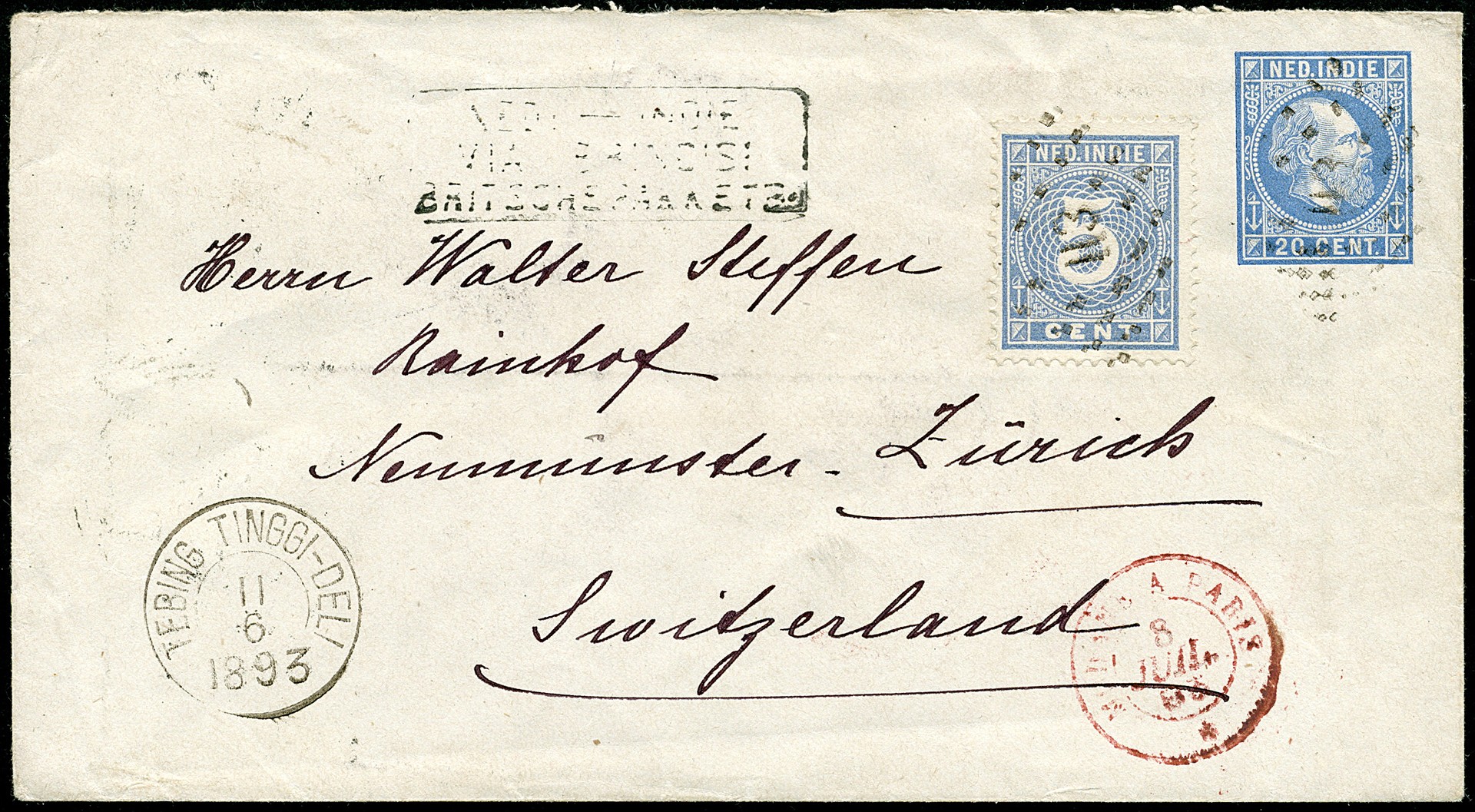 Env. G2b bijgefr. met 5c afgest. puntstempel 113 van Tebing Tinggi-Deli 11-6-1893 (superbe kleinrond!) via Medan 13-6, de N.I.Postagent Penang 14-6 (kleinrond) met de Britse pakketboot per traject Modane à Paris 8-7 naar Neumünster 9-7. Laat gebruik van punt- en kleinrondstempel