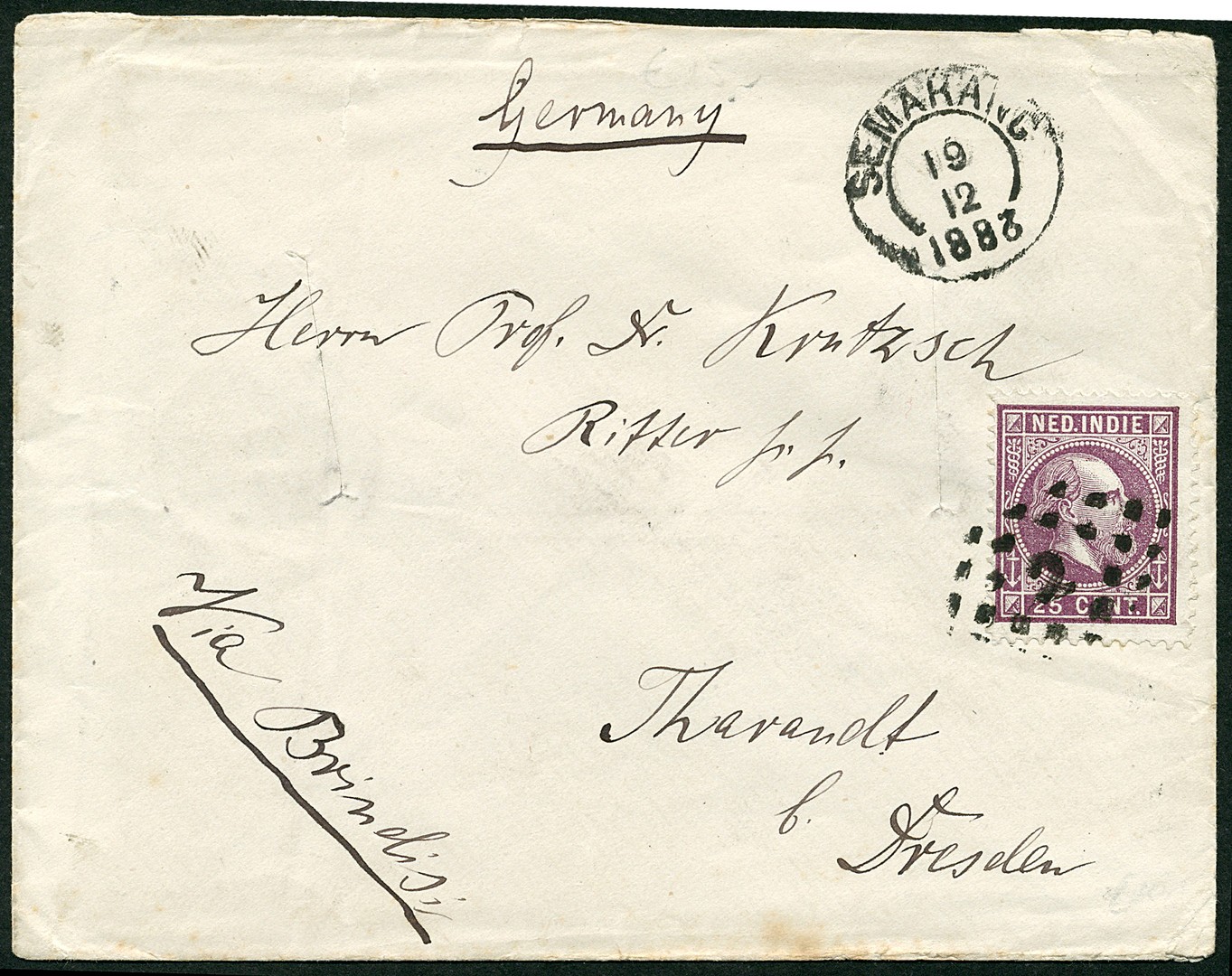 Gedesinfecteerd. Env. gefr. met 25c van Semarang 19-12-1883 over Weltevreden 23-12 ´Via Brindisi´ naar Tharandt 5-2-1883, en in verband met de choleradreiging (in 1884 reeds een feit) gedesinfecteerd te Nisida, een eiland dat door een brug met Napels is verbonden (in de env. zijn 2 insnijdingen aangebracht). Zie boeiend artikel 'De cholera epidemie in Napels' van Dr. Han T. Siem (Filatelie april 2018). Zeer weinig gedesinfecteerde post uit Indië in die jaren is bewaard gebleven