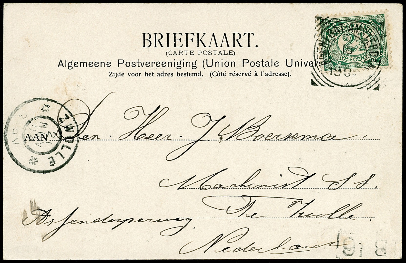 AGENT BAT:AMSTERDAM op prentbk. aan boord gefr. met Nederlandse zegel van 2½c van 18-11(?)-1904 naar een machinist te Zwolle 21-11