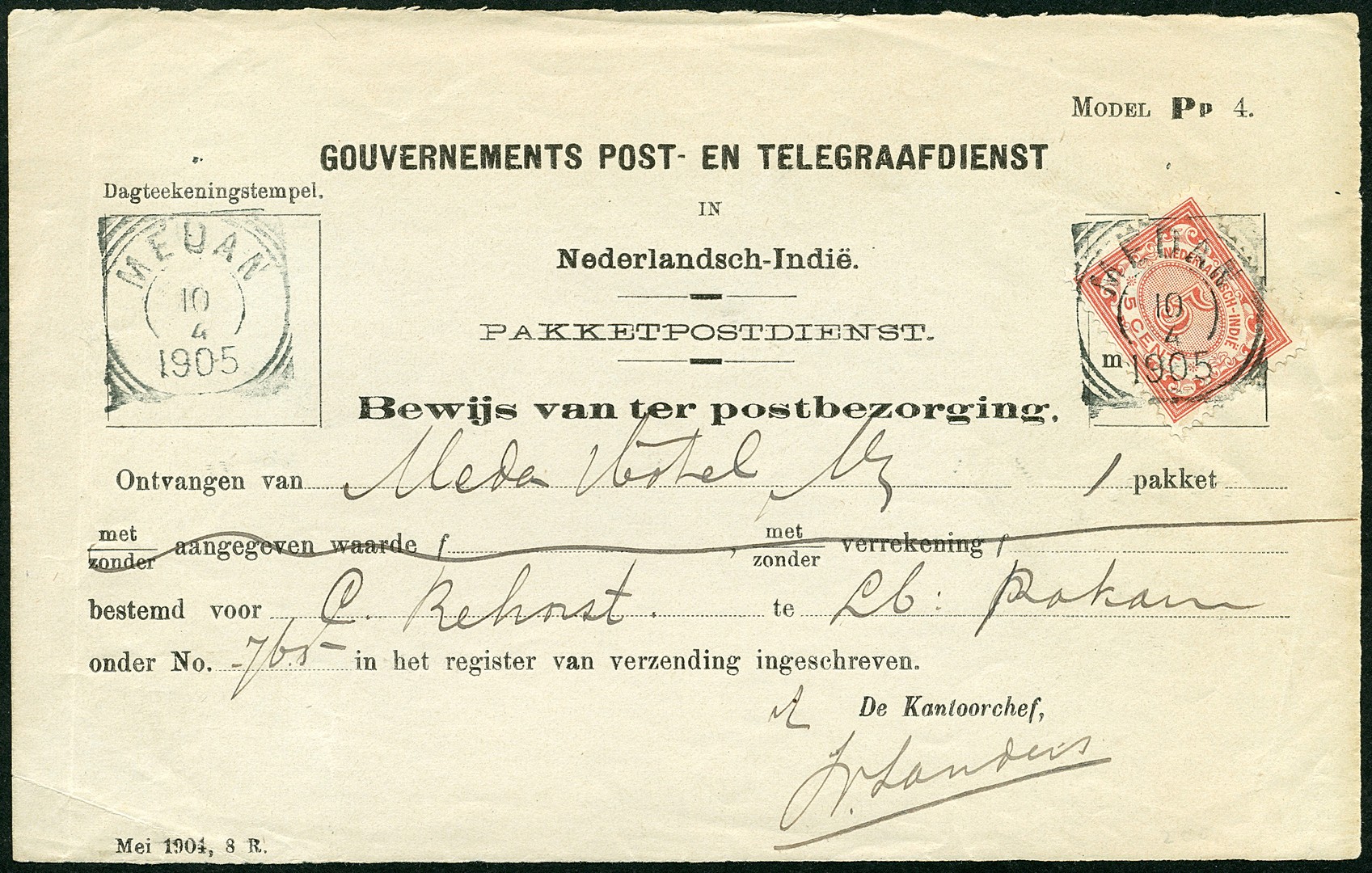 Bewijs van ter postbezorging van een postpakket (formulier Model Pp 4, Mei 1904, 8 R.) van Medan 10-4-1905 met bestemming Loeboekpakam