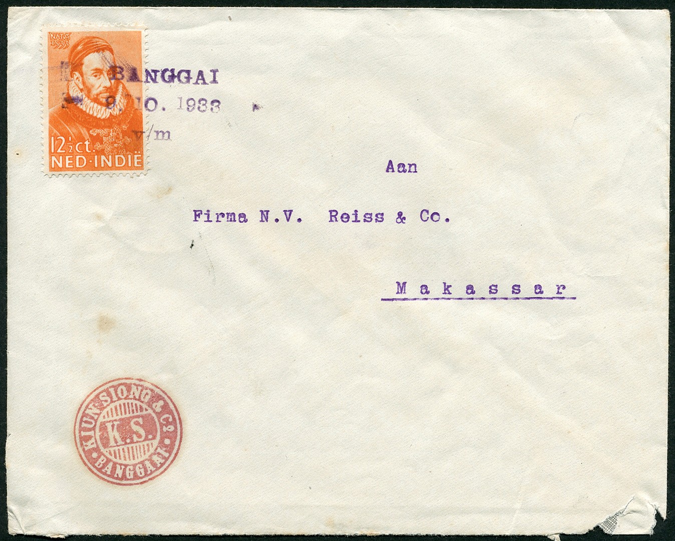 Iets beschadigde env. uit Banggaai (eiland bij Celebes) gefr. met Willem van Oranje, afgest. in violet met naamstempel ´Banggai/9.10. 1933/v/m´ van het fungerend hulppostkantoor ter plaatse, naar Makasser 20-10-1933. Prachtige en zeer zeldzame afdruk van de creatieve kantoorhouder. Er bestaat zelfs een tweede type van!
