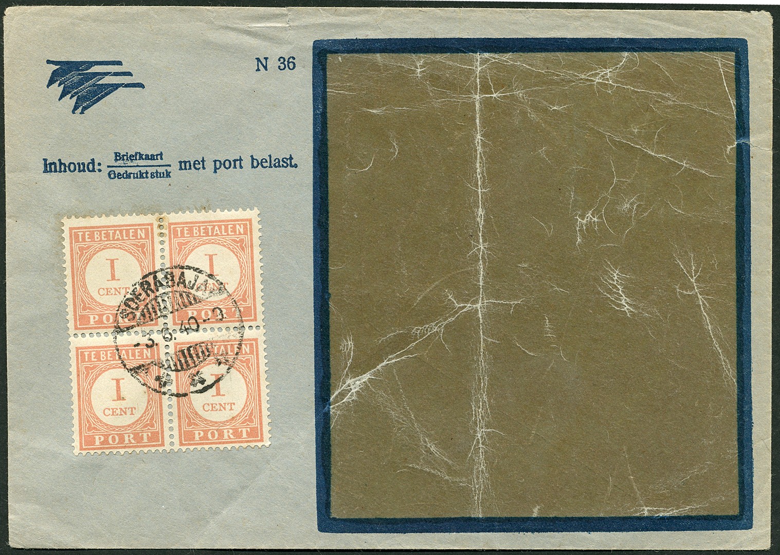 PTT-vensterenv. waarop 1c port in blok van vier, afgest. Soerabaja 3-6-1940. Echt gebruikte zegels zijn zeldzaam, op poststuk uitzonderlijk