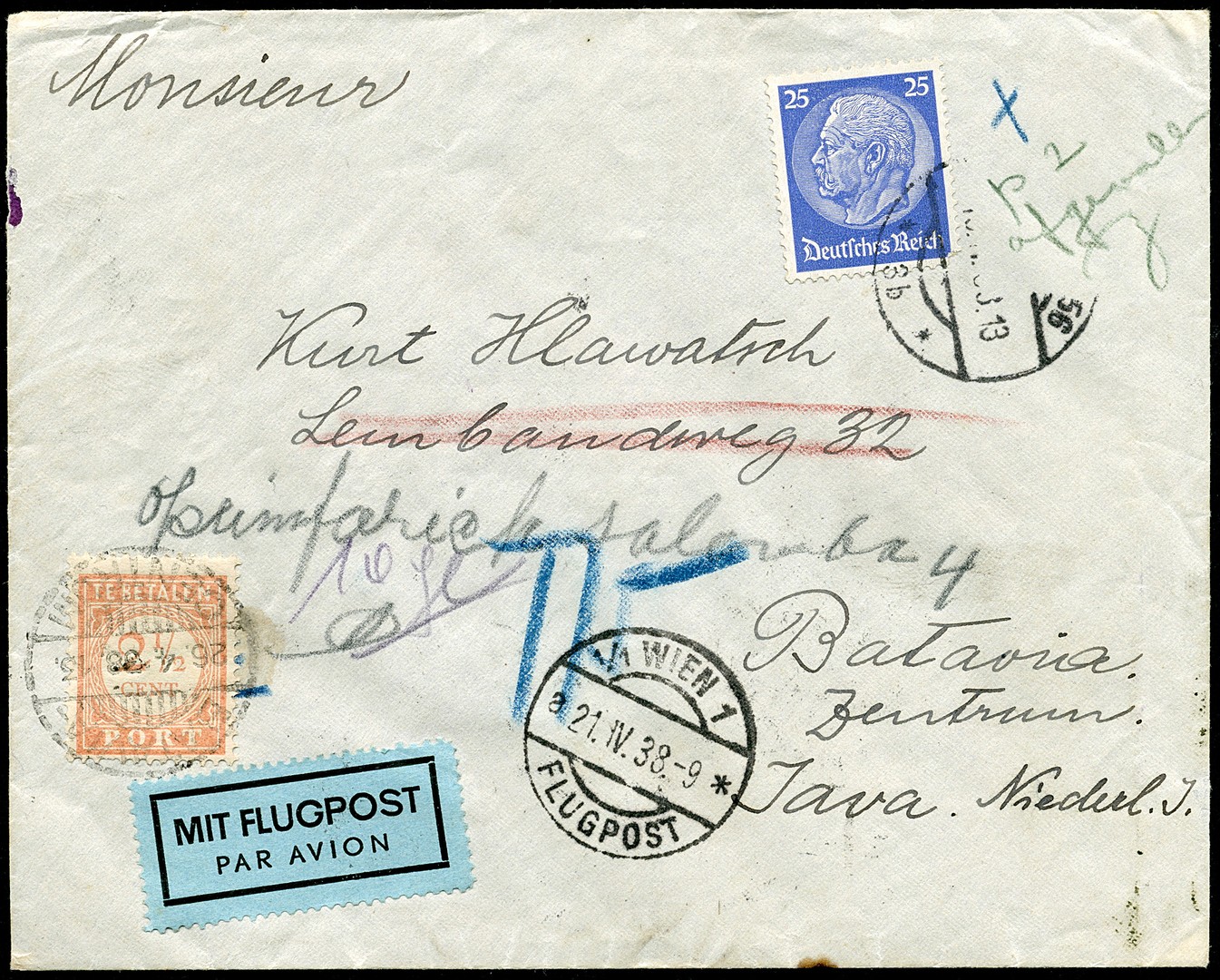 Env. uit Wenen 19-4-1938 met naast de Duitse zegel van 25pf een potloodnotitie ´P 2 afgevallen [+ paraaf]´ per luchtpost naar Batavia/Centrum en daar op 26-4 met slechts 2½ cent beport. Het adres is gewijzigd in ´Opiumfabriek Salemba´. Interessant portstuk!