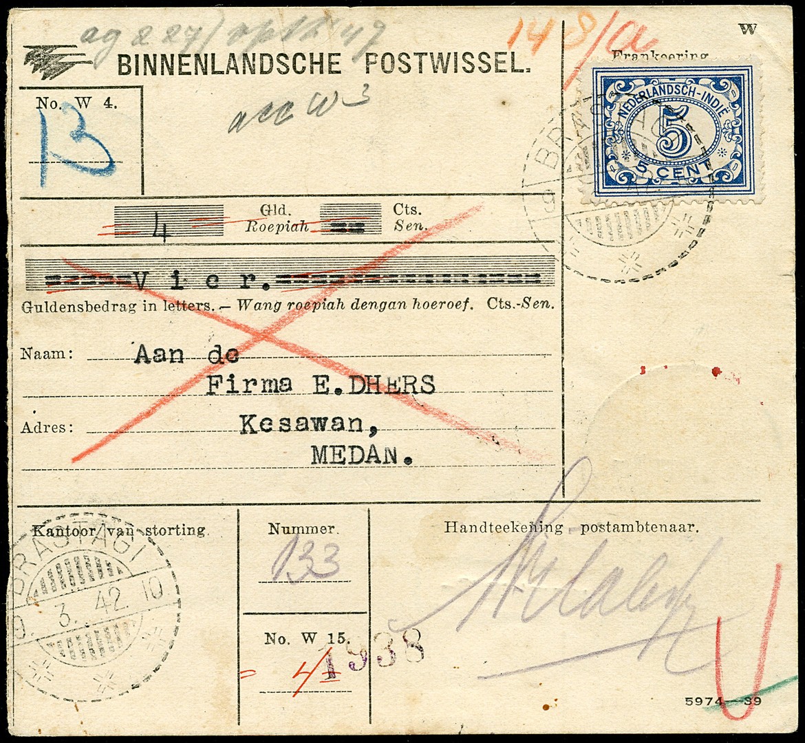 Postwissel waarop 5c afgest. Brastagi 9-3-1942, de eerste dag van de capitulatie van het KNIL, uit te betalen aan de handelsfirma E. Dhers (directeur A. Laplace) te Medan, wat pas op 1-2-1949 is geschied!