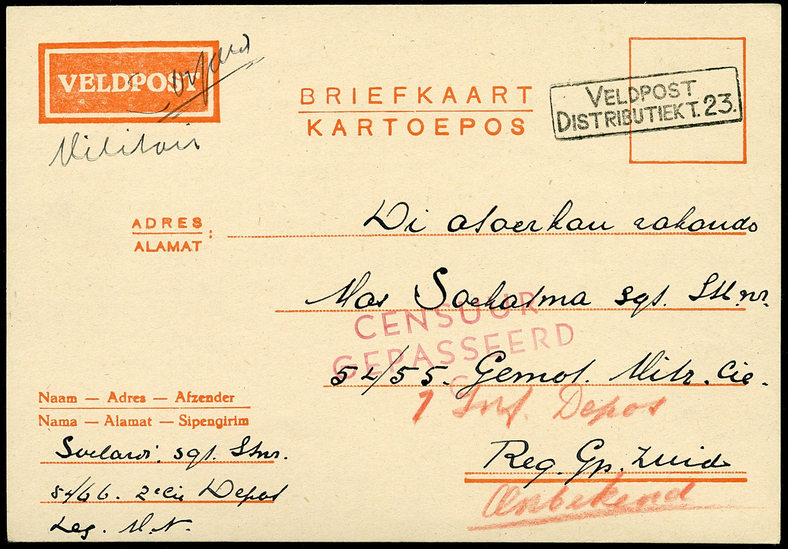 Vijf veldpostbriefkaarten 1941-42, afgest. met type ´Veldpost/Distributiekt.+nummer´ in kader (nrs. 2, 13, 23, 30 en 104)