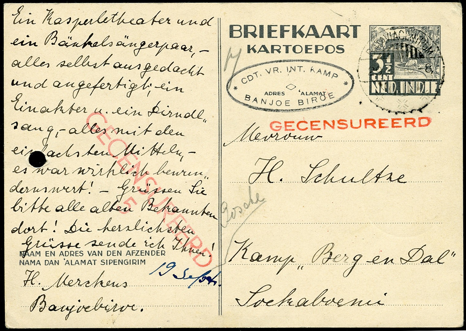 Interneringskampen. Ovaalstempel ´CDT. VR. INT. KAMP/BANJOE BIROE´ op bk. (links perf. gat) tweemaal gecensureerd, via Bataviacentrum 29-8-1940 naar een eveneens geïnterneerde dame in het kamp ´Berg en Dal´ te Soekaboemi. Luxe afdruk van zeldzaam kampstempel!