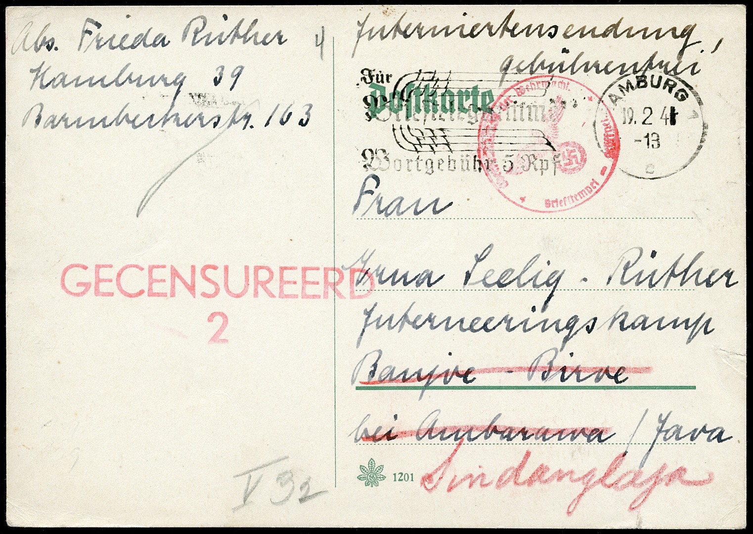 Interneringskampen. Portvrij (gebührenfrei) verz. bk. uit Hamburg 19-2-1941 naar een geïnterneerd familielid in het interneringskamp te Banjoebiroe, doorgez. naar het kamp in Sindanglaja. In Duitsland en Indië gecensureerd. Bewaard gebleven post uit Duitsland naar geïnterneerde Duitsers in Indië is uitermate zeldzaam, ons nog geen tweede voorbeeld bekend