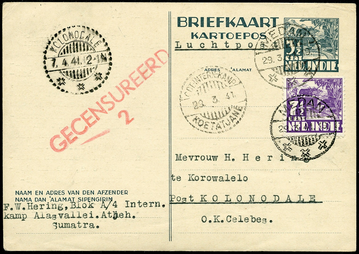 Interneringskampen. Kampstempel ´CDT.-INTERN.-KAMP / KOETATJANÉ 29.3.41 op gecensureerde bk. bijgefr. met 7½c via Medan 29-3-1941 per luchtpost naar een negorij nabij Kolonodale 7-4 (Celebes)