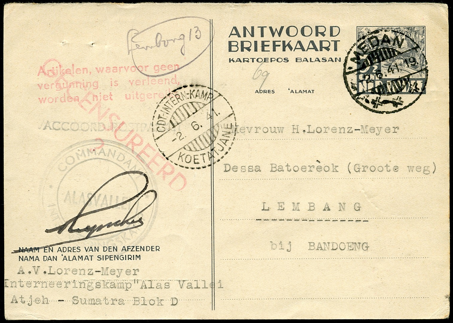 Interneringskampen. A-kaart G64 met aan az. opsomming van goederen bestemd voor geïnterneerde in het kamp te Koetatjané, waarvoor zijn vrouw aan de commandant toestemming vroeg om te mogen versturen aan haar geïnterneerde man. Op 2 goederen na heeft mevrouw toestemming gekregen, wat haar d.m.v. deze antwoordkaart werd bericht. Linksboven in rood gestempelde tekst ´Artikelen, waarvoor geen vergunning is verleend, worden niet uitgereikt´