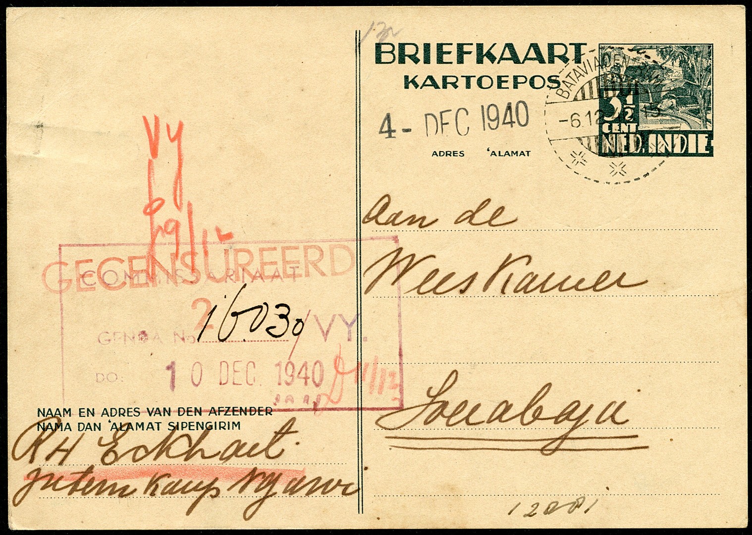 Interneringskampen. Datumstempel ´4- DEC 1940´ in stede van een kampstempel op gecensureerde bk. uit het kamp te Ngawi via Bataviacentrum 6-12-1940 naar de Weeskamer te Soerabaja