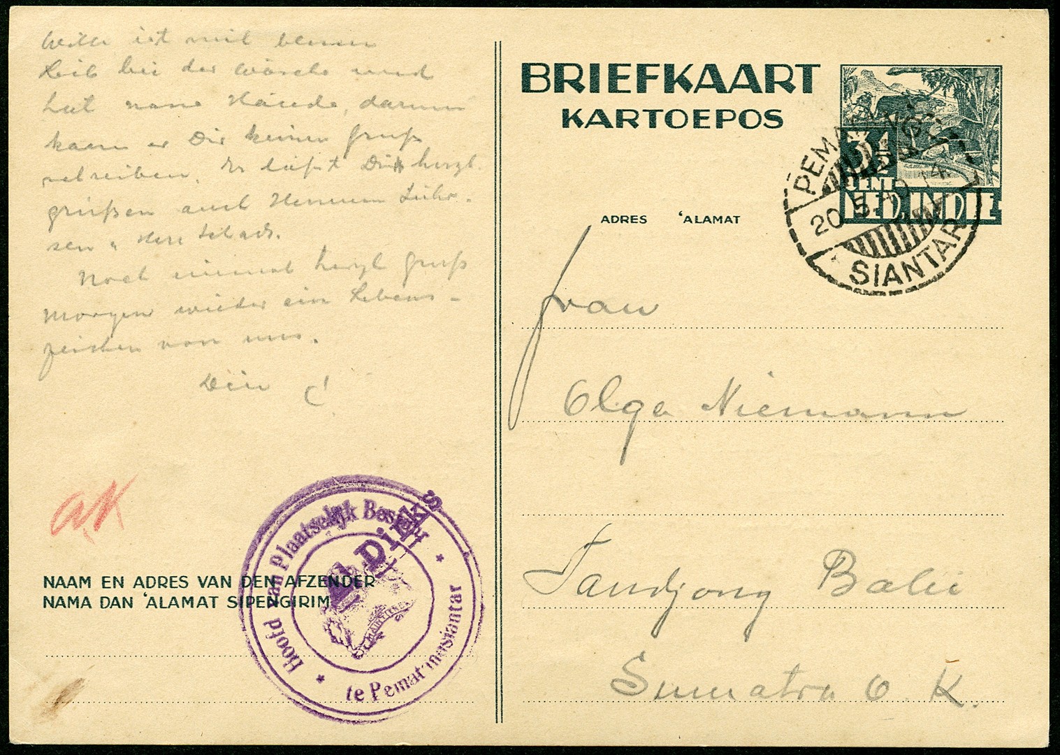 Interneringskampen. Rondstempel ´Hoofd van Plaatselijk Bestuur / te Pematangsiantar´ waaroverheen het naamstempel ´A. Dirks´ op bk. van geïnterneerde echtgenoot via Pematang-/Siantar 20-5-1940 naar zijn vrouw in Tandjongbalei. Ogenschijnlijk geen censuurkenmerk (of het met rood potlood geschreven ´AK´?). Door ons zijn deze stempels nog niet eerder gezien
