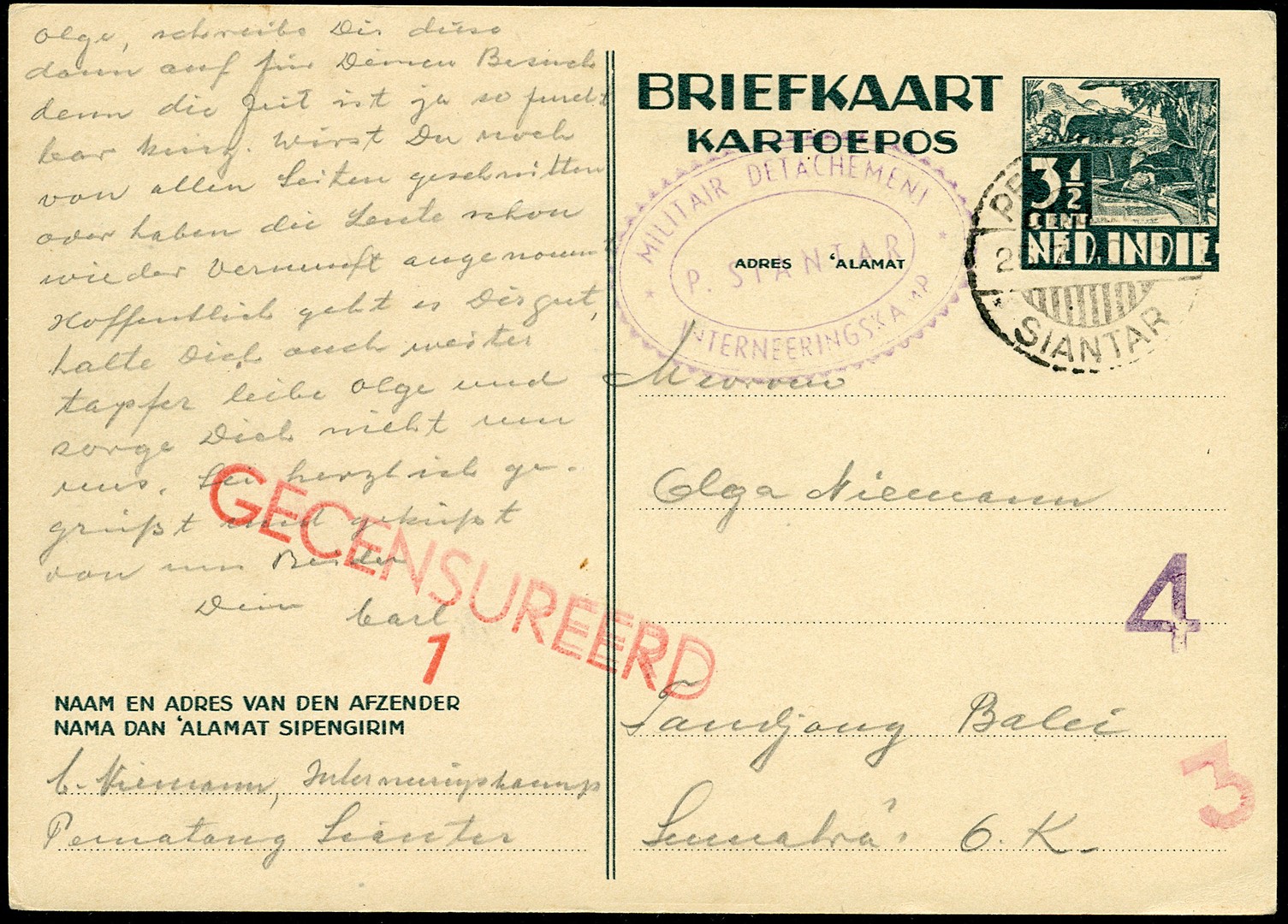 Interneringskampen. Ovaalstempel ´MILITAIR DETACHEMENT/INTERNEERINGSKAMP/P. SIANTAR´ op gecensureerde bk. via Pematang-/Siantar 25-7-1940 naar echtgenote in Tandjongbalei, waarop tevens rode ´3´ en violette ´4´