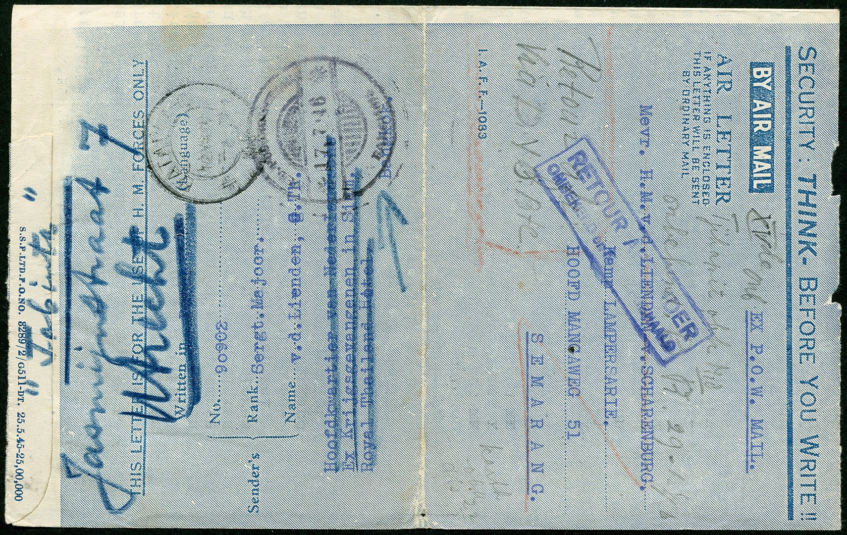 Geallieerd luchtpostblad van een sergeant-majoor, ex POW, in Bangkok op 21-11-1945 op zoek naar zijn Innig geliefde Puk, geadresseerd in het kamp Lampersari te Semarang. Uiteindelijk retour en op 17-7-1946 afgest. Ned. Postkantoor Bangkok. Brief ook historisch interessant voor de inhoud, zoals langs de Burma-spoorweg: ´... en er loopt nu een gerucht dat alle menschen opgegraven zullen worden om allen op een massaal kerkhof begraven te worden.´