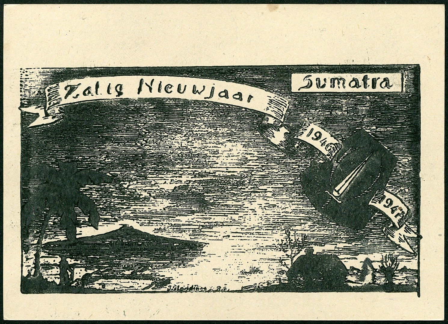 Briefkaart G75 met aan de schrijfzijde zwarte druk ´Zalig Nieuwjaar. Sumatra. 1946-1947´, zelfde ontwerp van J. Gladdines I-R.S. als van Salatiga, niet verzonden maar geschreven ´De allerbeste wensen en spoedig weerziens. De Stoter´ (Regiment Stoottroepen)