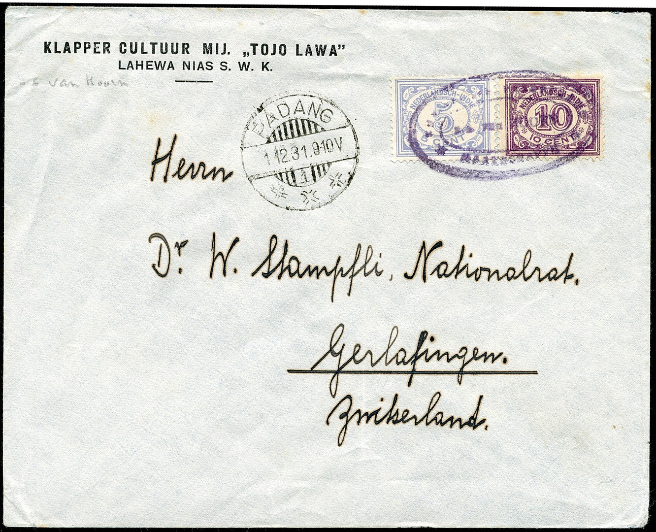 Firmacouvert uit Lahewa (Nias, Sumatra) gefr. met 5c en 10c afgest. met KPM-ovaalstempel ´s.s. van HOORN´ over Padang 1-12-1931 en Medan 4-12 naar Zwitserland