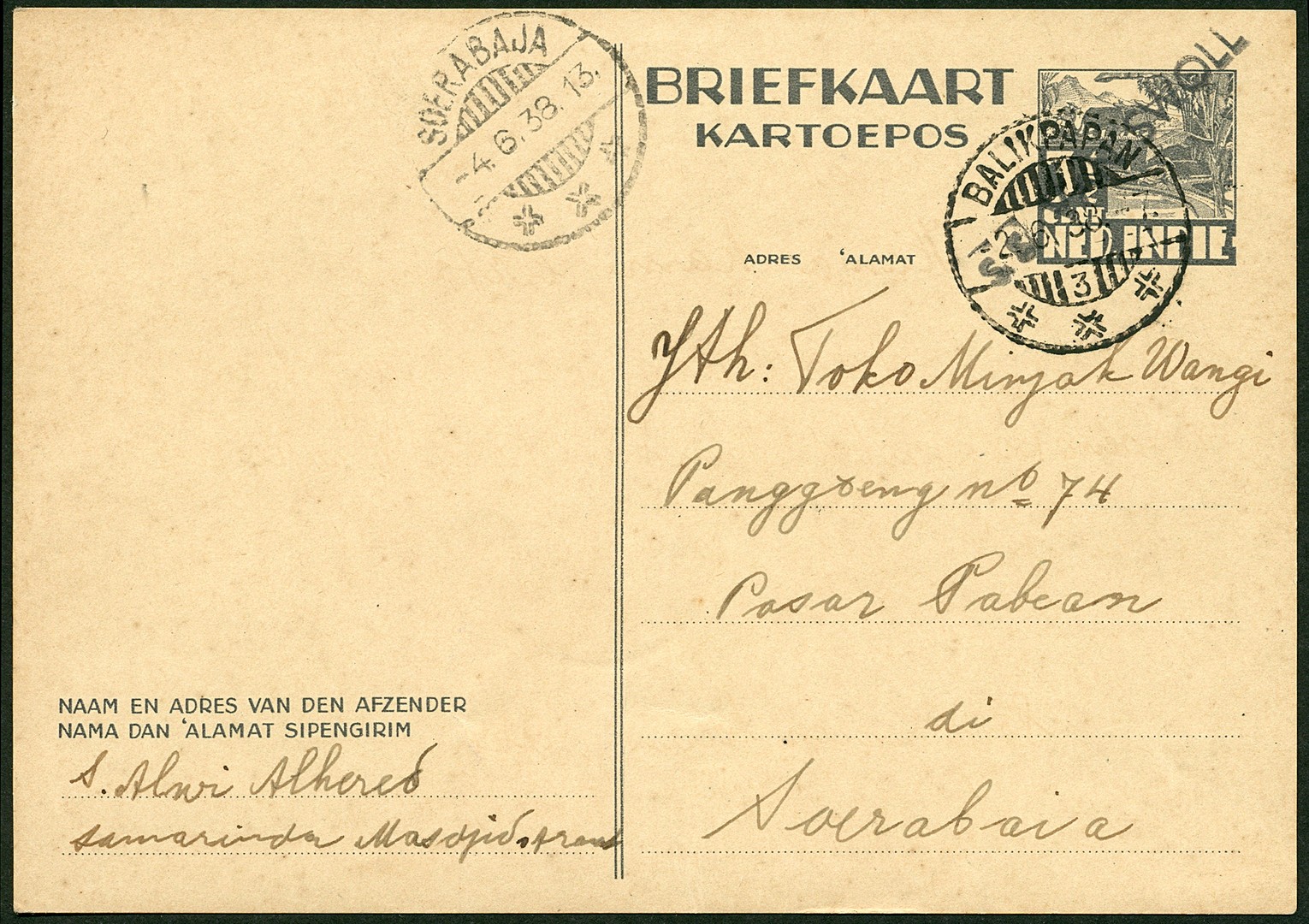 Bk. van 3½c uit Samarinda afgest. met KPM-naamstempel ´s.s. VAN SWOLL´ over Balikpapan 2-6-1938 naar Soerabaja 4-6
