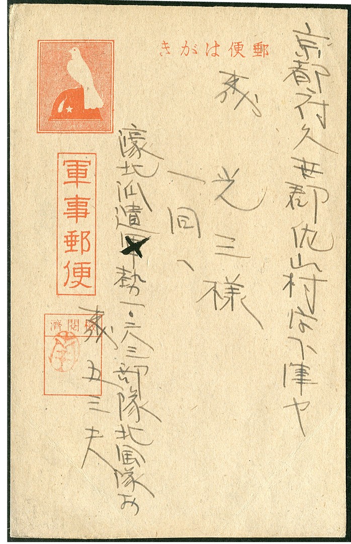 Japanese Military fieldpost card type ´Dove and Helmet´ Bu. F22 from Unit 10283 (North Australia Expeditionary Force) in occupied Manokwari, Dutch New Guinea, to Kyoto. Card is censored with Minami chop. Message is from son to his parents saying he is well but broke the frame of his glasses. He asks if they would send him a new frame which he has in a drawer in the living room. They should pack it in a small wooden box and send it by mail. Ex Jennings