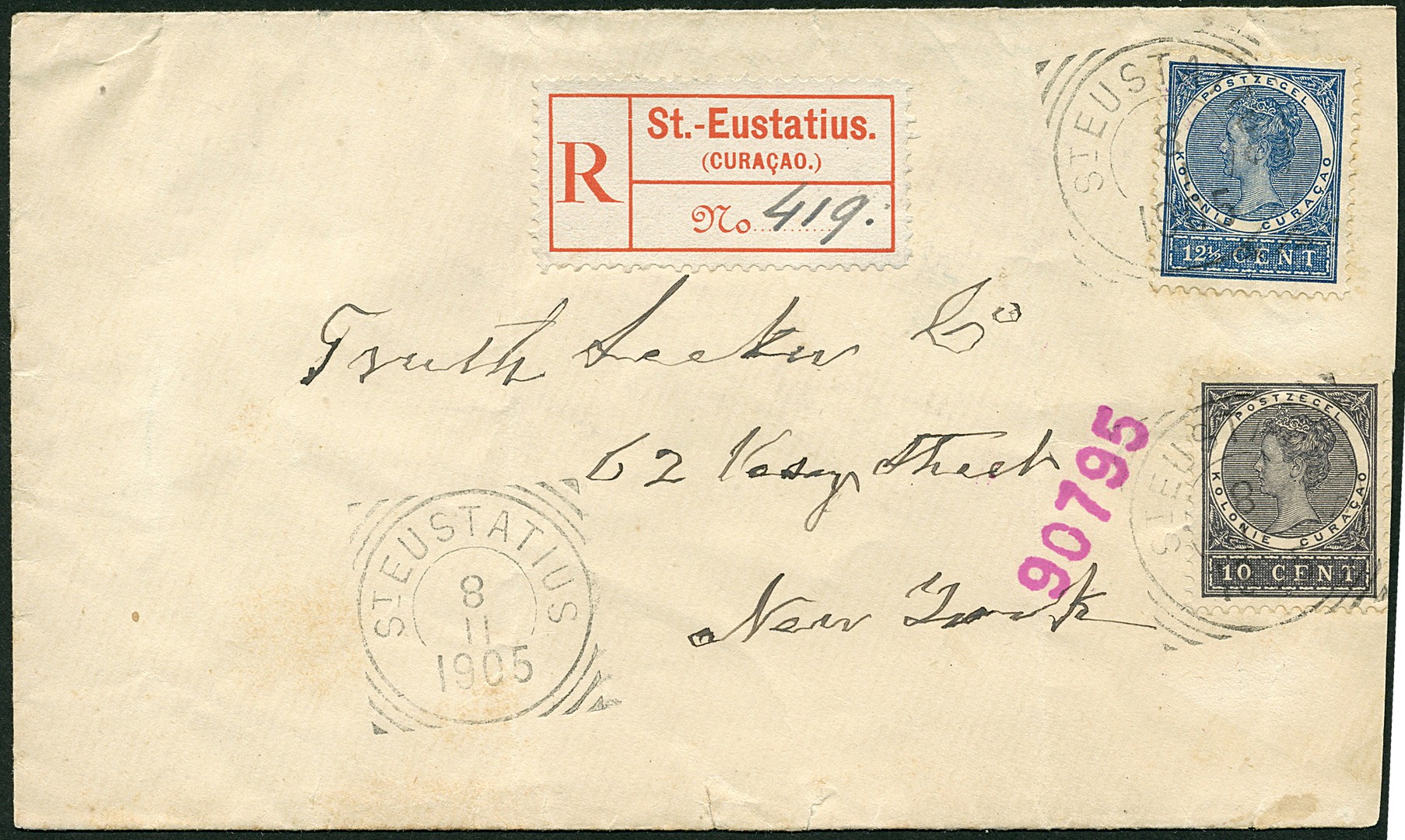 ST.EUSTATIUS op wat minder mooie env. gefr. met 10c en 12½c Veth aangetekend op 8-11-1905 naar New York 24-11