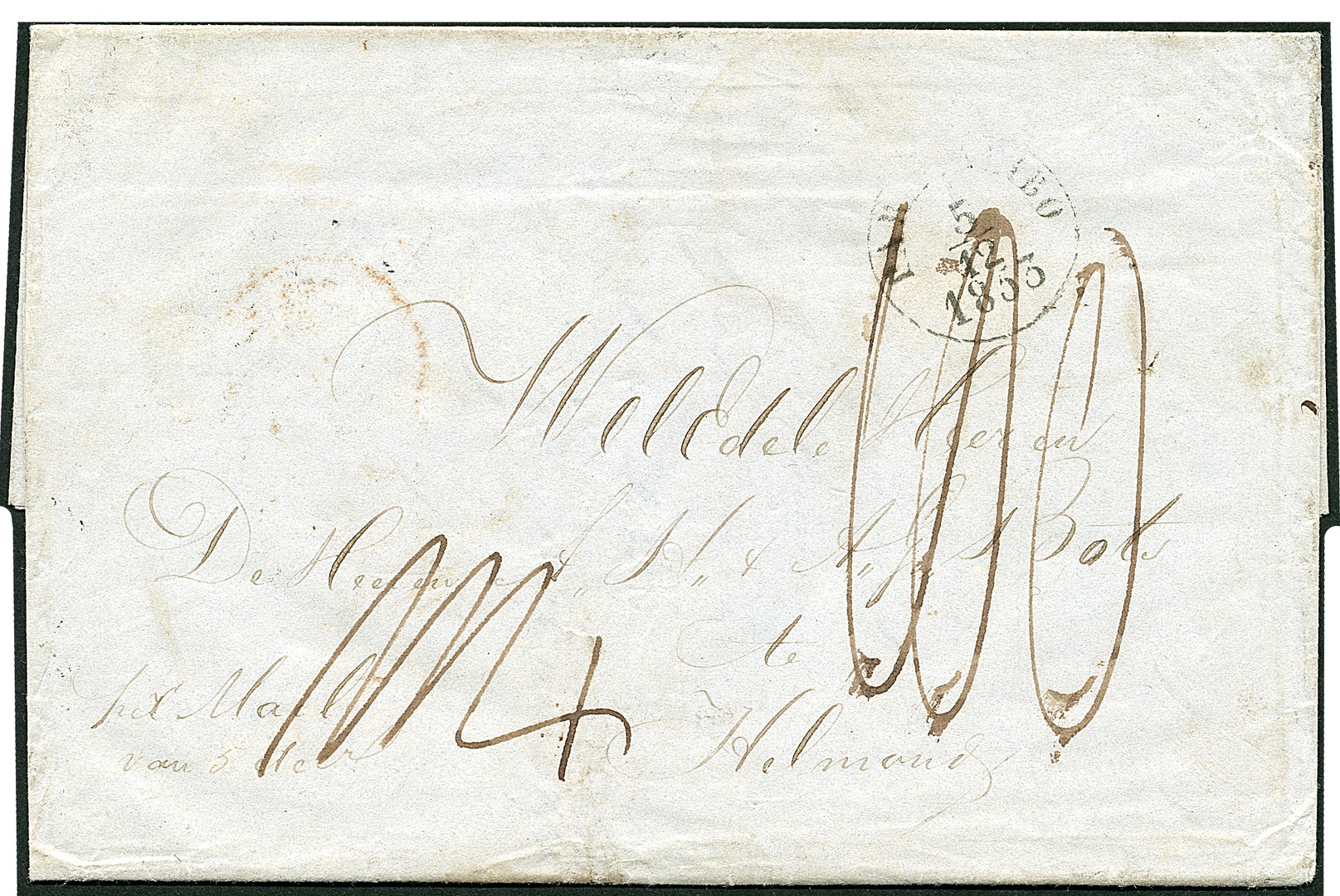 Cpl. vouwbrief van J.P. Haase jr. te Paramaribo 5-12-1853, met een prachtig geïllustreerde wisselbrief van 17-11-1853 voor fl. 1992,33 nog ingesloten, via Demerary 8-12 en Londen 5-1-1854 naar Helmond 7-1