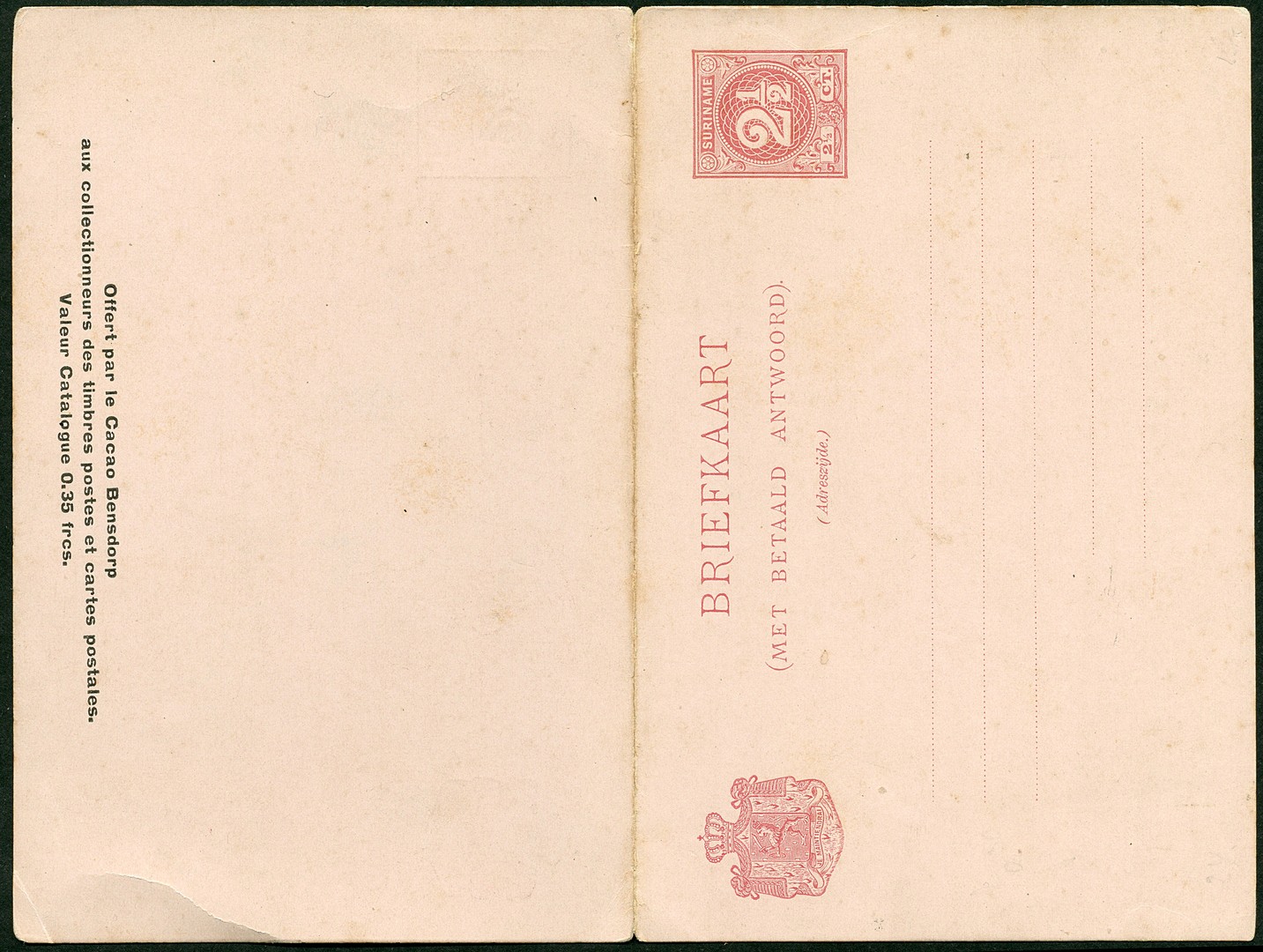 Ongebruikte dubbele bk. G12 met op az. van de A-kaart een zwarte reclameopdruk ´Offert par le Cacao Bensdorp/aux collectionneurs...´ Door ons nog niet eerder gezien