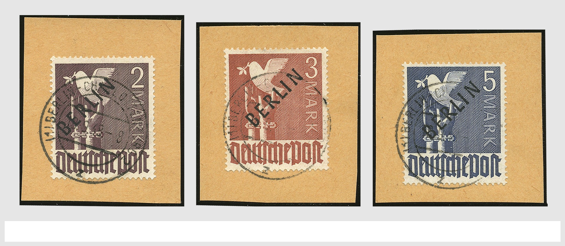 BERLIJN 1/20, Zwart-opdrukken 2 Pf. t/m 5 M. compleet gebruikt op briefstukjes gesigneerd: Rehfeld en attest Schlegel (1994) "einwandfrei". Cat.wrd. ? 2400