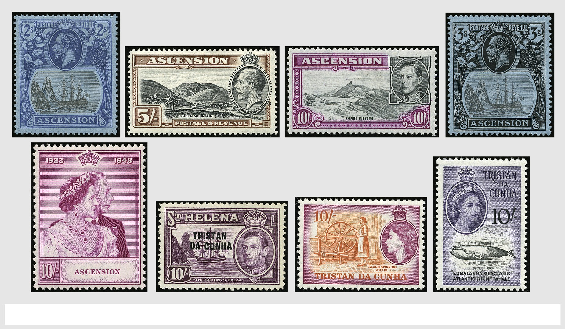 ENGELSE KOLONIËN, Ascension en Tristan da Cunha, o/*/** op insteekbladen met veel langlopende series zoals S.G. 10/20 *, 21/30 *, 38/47 *, 50/51, 57/83 en Tristan da Cunha 1/27, 28/41 (2), 42/54, 71/84, alle in nette kwaliteit