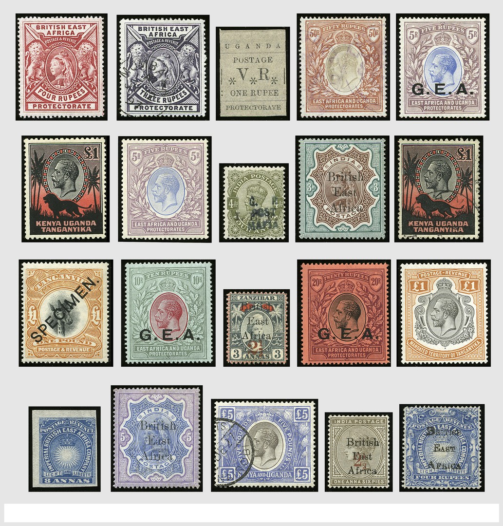 ENGELSE KOLONIËN, Brits Oost Afrika-Uganda-Tanganyika 1890-1965, o/*/** verzameling op insteekbladen met vele goede nrs. zoals GEA S.G. 45/62, 63/68, Tanganyika 83/88 Specimen, 102/07, Brits Oost Afrika 12a (£.10.000 pair) met certificaat, 61/63, Kenya/Uganda 44/57, 110/23, 131/50, 167/80, etc. Prachtkoop met hoge waarde!