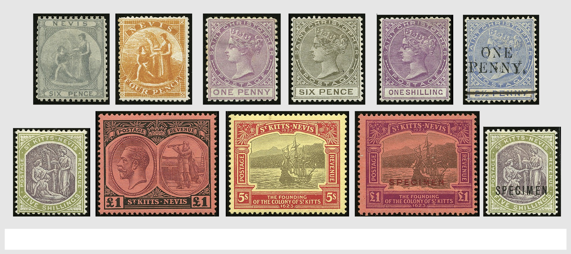 ENGELSE KOLONIËN, St. Kitts-Nevis en St. Cristopher 1862-1963, o/*/** verzameling op insteekkaarten met beter materiaal o.a. St. Kitts-Nevis S.G. 36, 48/57, 59, 60 (spec.) verder een mooie selectie 1e emissie van Nevis en St. Cristopher met div. goede nrs.