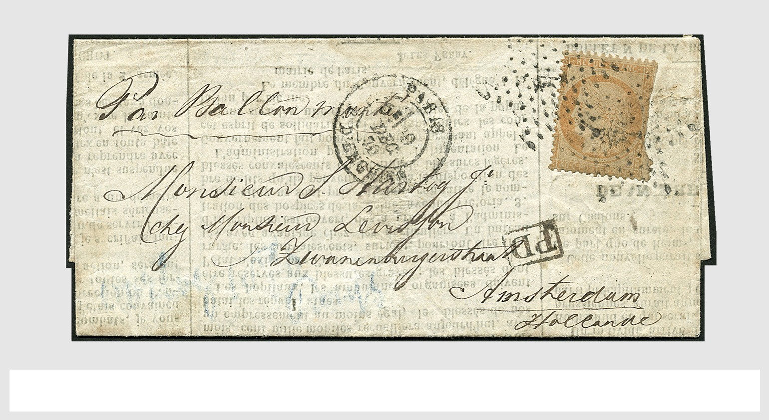FRANKRIJK, BALLON MONTÉ. Journal-Poste No. 11 van 6-12-1870 gefr. met 40c Yv.38 (al beschadigd opgeplakt) van Paris/R. D´Enghien 9-12, opgestegen met de Général Renault, verzonden naar Amsterdam (az. onleesbaar aankomststempel naast bestellersstempel). Op vz. ´PD´ in zwart. ? 1300