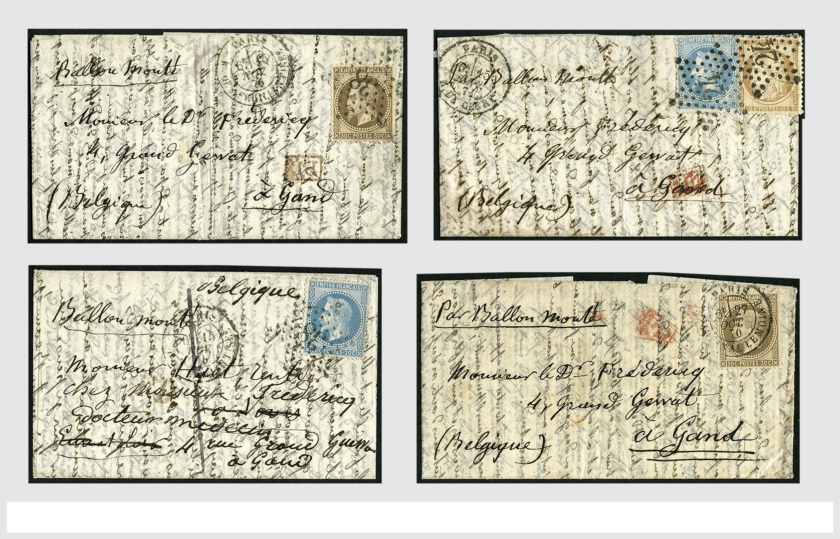 FRANKRIJK, BALLON MONTÉ. Vijf mooi bewaard gebleven brieven naar hetzelfde adres in Gent, alle op de vz. afgest. met ´PD´. Brief gefr. met 30c Yv.30 van 1-10-1870, brief met 30c Yv.30 van 27-10-1870, brief met 20c Yv.29 van 15-11-1870 en eveneens brief maar met 30c Yv.30 van 15-11-1870, alsmede brief met 10c + 20c Yv.36+29 van 15-1-1871