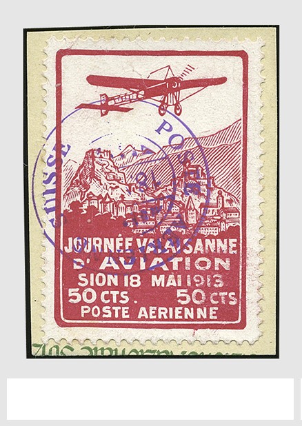 ZWITSERLAND, Luchtpost-Voorloper 'SITTEN', 50 cts karmijn op glanzend papier, Mi.nr.Xy op briefstukje met officieel violet stempel "Poste Aerienne Suisse 18.V.13", met cert. Rellstab (1997) ...einwandfrei. Cat.wrd. ? 1800