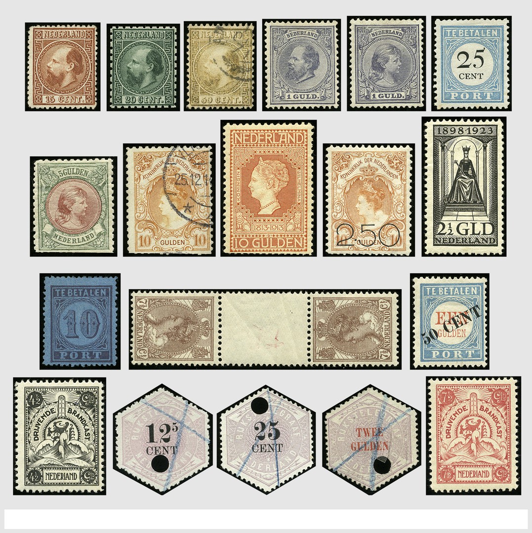 1852-1999, o/*/** verzameling in 4 Davo albums, wb. diverse betere nrs. en series o.a. 8, 9 en 10 *, 13/18 *, 28 * (roestpuntje), 34/44 *, 48 * (zfr.), 61b en c, 80, 101 *, 104/05 *, 130/31 *, 149/65 *, 177/98, Internering 1/2, Postbewijs 1/7, Brandkast 1/7 *, Dienst 1/8 *, Port compleet ongebr. (ex. 7), Roltanding cpl. (ex. 32) en Telegram 1/12 cpl.