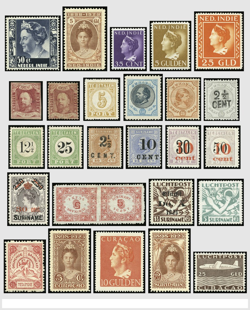 O.G.D. 1864-1980, ongebr. resp. postfrisse verz. in Holland album. Ned.-Indië, Ned. Nw. Guinea, Curaçao, Antillen en Suriname, in de hoofdnummers geheel compleet! Enkele nrs. met bemerkingen, maar ook goede oudere ex. postfris! Een geheel intact gelaten verzameling met een enorme cataloguswaarde!