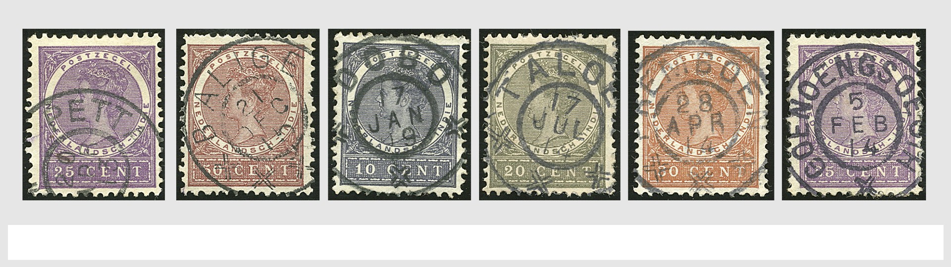 NED.- INDIË POSTHISTORIE, grootrondstempels op losse zegels w.o. veel prachtige afdrukken, ook van zeldzame stempels als Banggaai, Bima, Bintoehan, Dobo, Kanigoro, Moearasabak, Moeara-Saibi, Papar, Petta, Samboe, Sendaranagoeng, Siborongborong, Tjalang, etc. opgezet op bladen met lokatie-aanduiding, in ringband. Prachtig object om voort te zetten!
