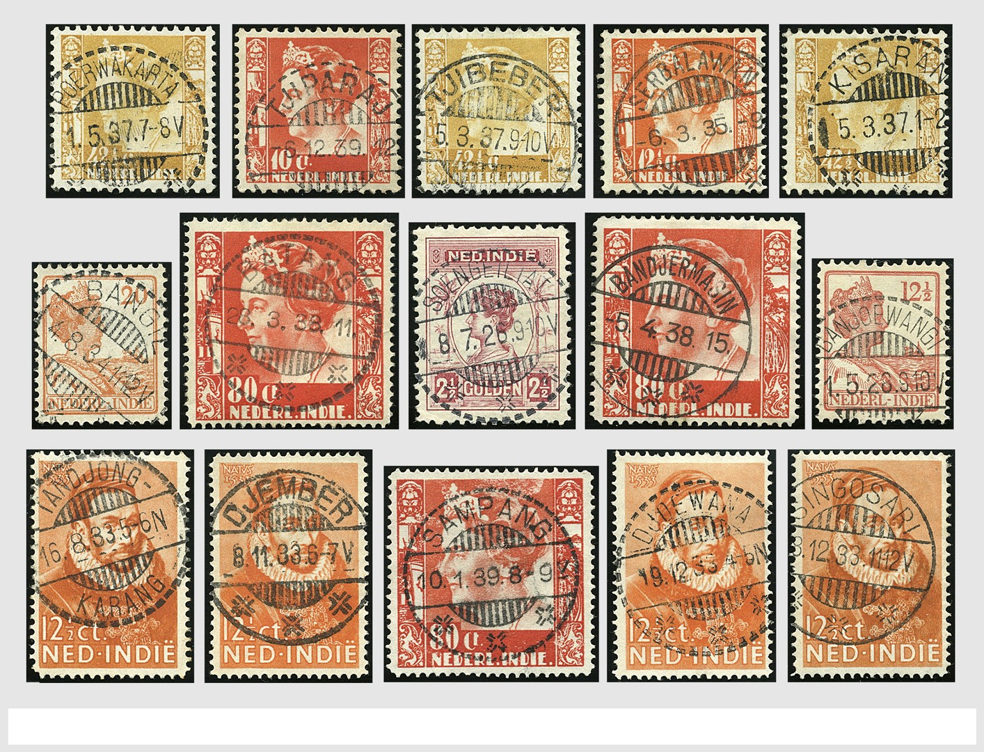 NED.- INDIË POSTHISTORIE, langebalkstempels op losse zegels w.o. veel prachtige afdrukken in diverse typen op verschillende emissies en waarden, ook wat uit de periode 1945-49, in dik insteekboek. Mooi object om verder uit te breiden en op te zetten