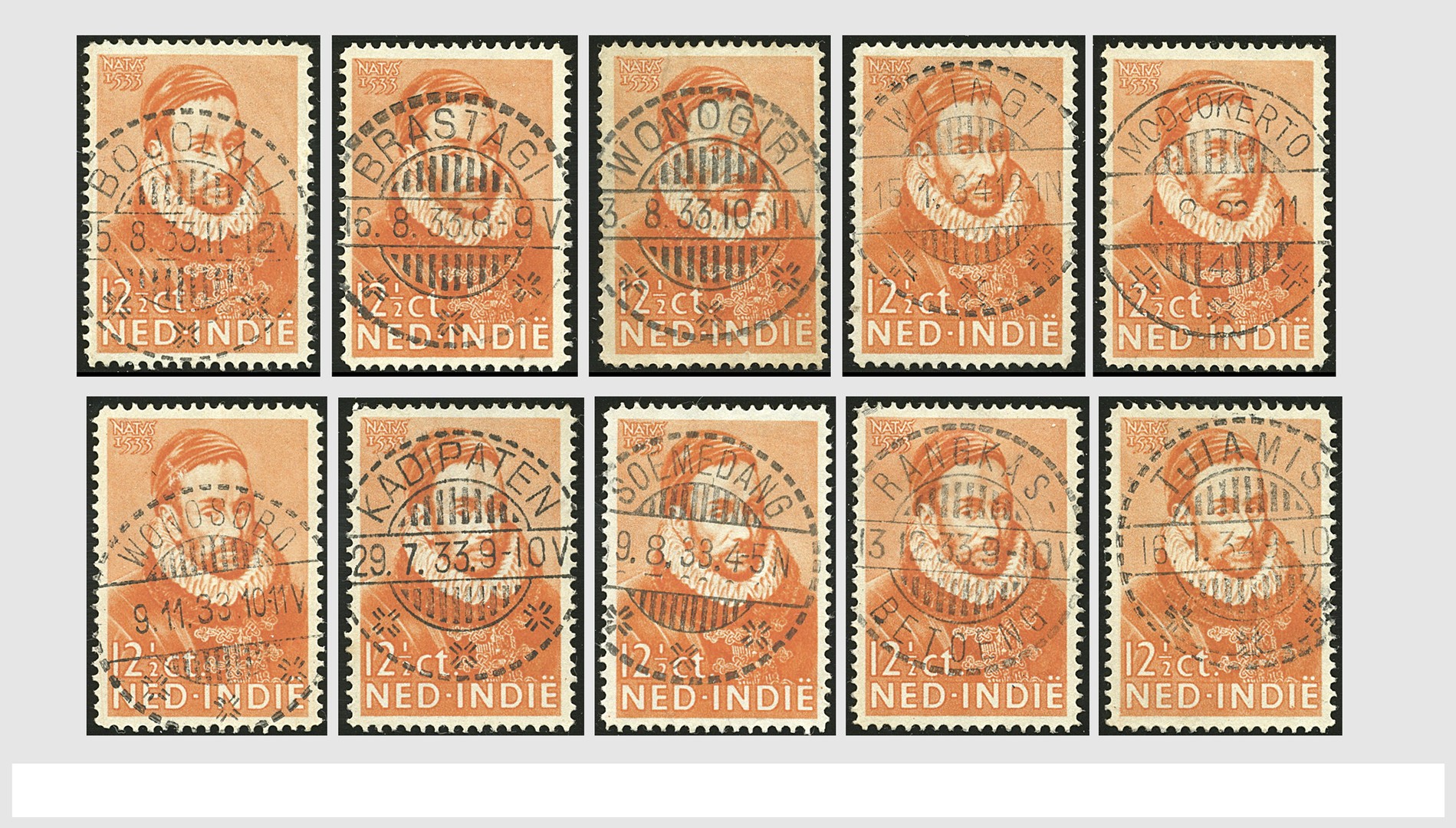 NED.- INDIË, Stempelcollectie op Willem van Oranje nr. 180 w.o. langebalk op volgorde met diverse kleine kantoren (o.a. Hollandia en Seroei), veel prachtafstempelingen, wat haltes, KPM, ruit, machine, alsmede ongebruikte zegels met plaatfouten en druktoevalligheden, ook iets van Curaçao en Suriname, in KaBe-ringband