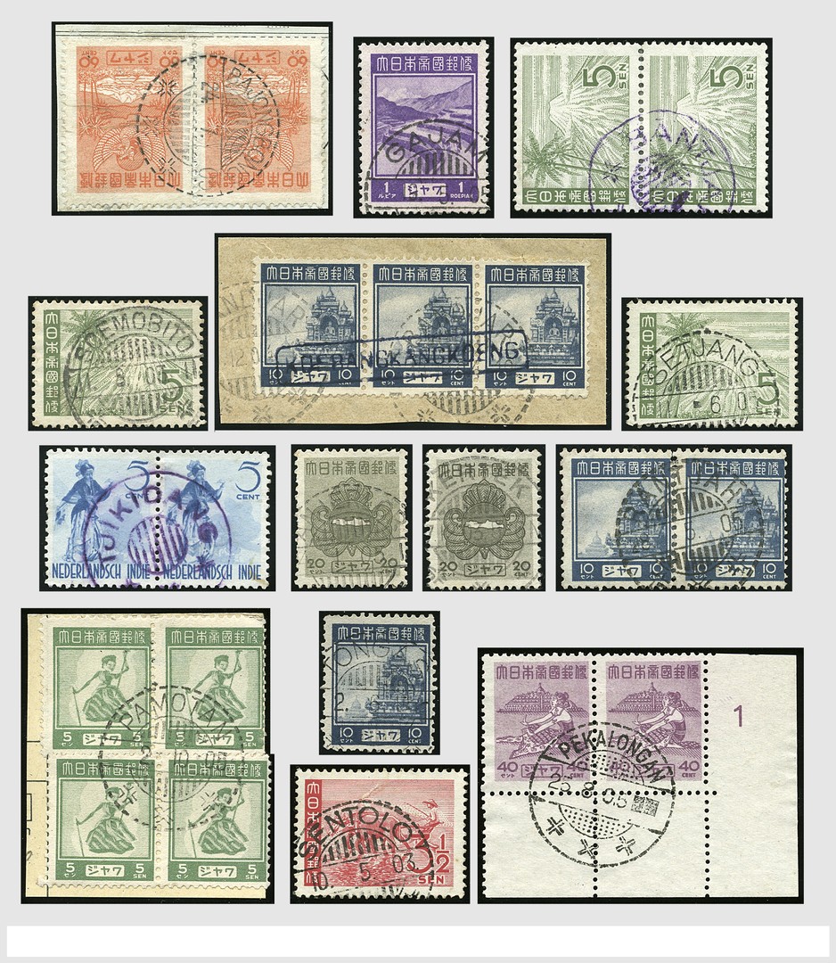 JAPANESE OCCUPATION 1942-1945, JAVA POSTMARKS, wonderful and almost complete collection of postal cancellations of Java and Madoera, on many thousands of stamps, some on piece, of several postal issues and values, with circular date cancellations in several types of post, sub-post and branch post offices, some delivery houses, propaganda and commemorative cachets, machine and roller postmarks, of course including the greatest rarities, superbly written-up in alphabetical order on album leaves, housed in 13 KaBe ring binders. We think it is the most extensive collection in this field and of exhibition stature. Ex Leo B. Vosse